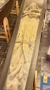 and wealthy parishioners interred in the crypt. The crypt floor is raised and the space dimly lit but you can walk among the mummies, some wrapped in now-darkened white fabric.